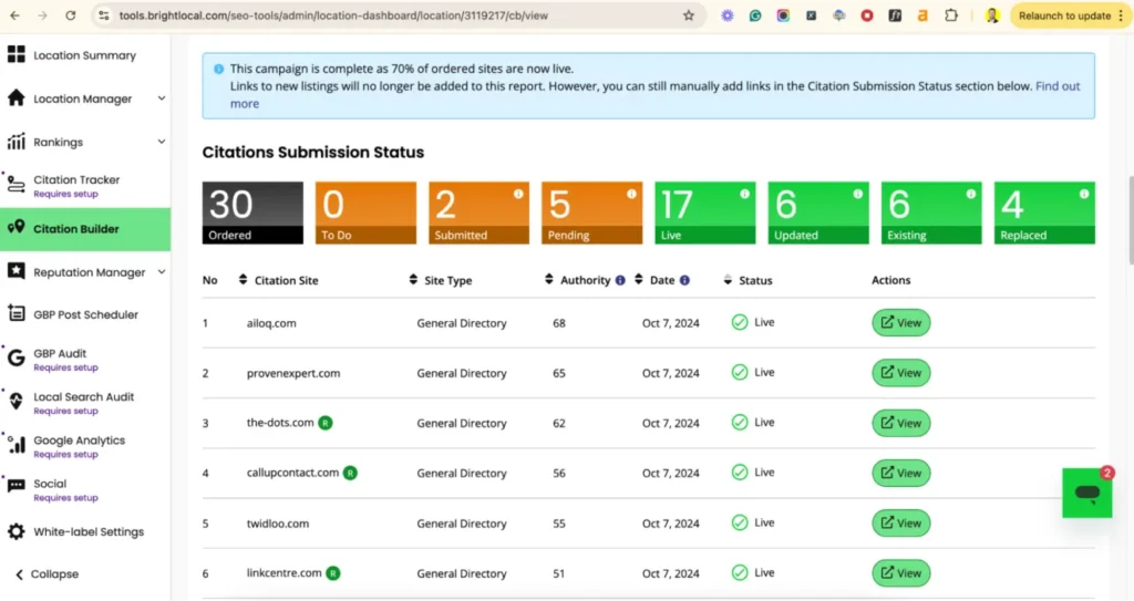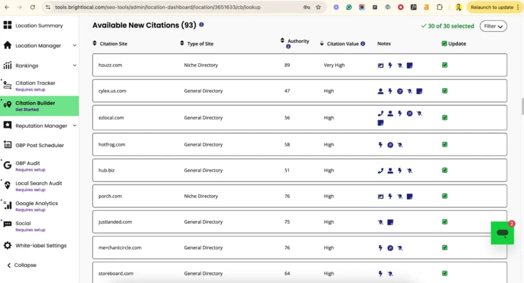 - Use Citation Monitoring Tools: Use BrightLocal to monitor the accuracy of the business’s citations across the web. These tools help track and fix any incorrect or inconsistent listings.