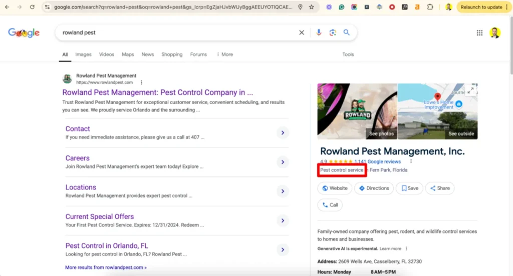 - Verify Business Category: In the Google Business Profile dashboard, check the Primary Category to verify that it accurately represents the business’s main service (e.g., “Pest Control Service”). Add secondary categories if necessary, such as “Termite Control” or “Rodent Removal.”