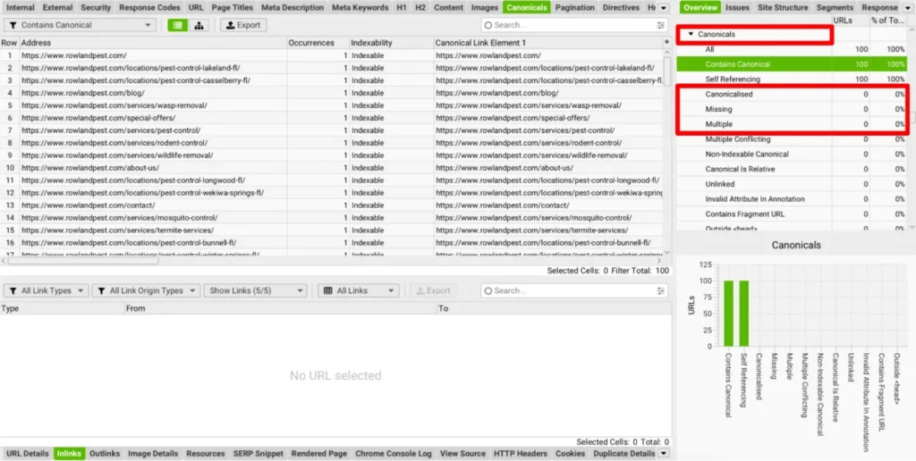 Screaming Frog SEO Spider -> Canonilcals -> Missing