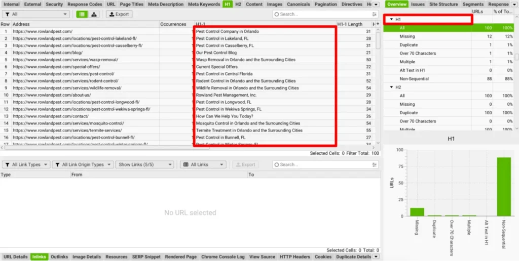 - Check Keyword Optimization: Verify that the H1 tag contains the primary keyword for that page. For example, if the page concerns termite control services in Boston, the H1 tag should include a keyword like “Termite Control in Boston” rather than something generic like “Our Services.”