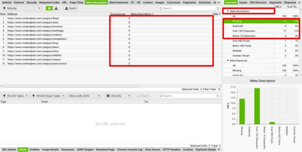 Screaming Frog SEO Spider -> Meta Descriptions -> Missing
