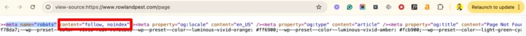 - Check Meta Robots Tags: For key pages (like service pages, contact pages, or the homepage), inspect the page source for the meta robots tag. It should look like this: <meta name=”robots” content=”index, follow”>